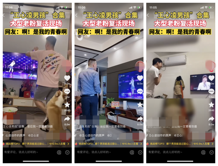 在许多短视频平台上,当王心凌《爱你》前奏再一次响起的时候,不少中年男粉顾不上身段和形象开始跟跳昔日偶像的舞蹈,一些男粉还自称是“ 王心凌男孩”并表示:“我们还在,只是老了,没想到心凌还是原来的模样。”