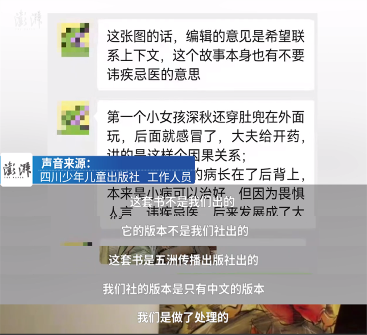 但澎湃新闻注意到,川少社版《三个医生》经过图片处理虽然修改了部分插画,不过有争议的部分图片却仍留在绘本内,工作人员解释称,留下该图片是为连贯上下文,而女性露出后背是为了露出伤口,经与作者沟通未作修改。