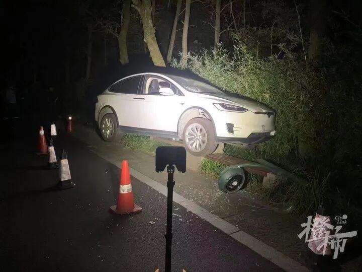 “走到附近一看,发现是辆白色的特斯拉,车子撞了路灯,开到了路边的休息椅上。”黄宗炎和队员走到男子旁边,问车子是不是他的?男子点点头。