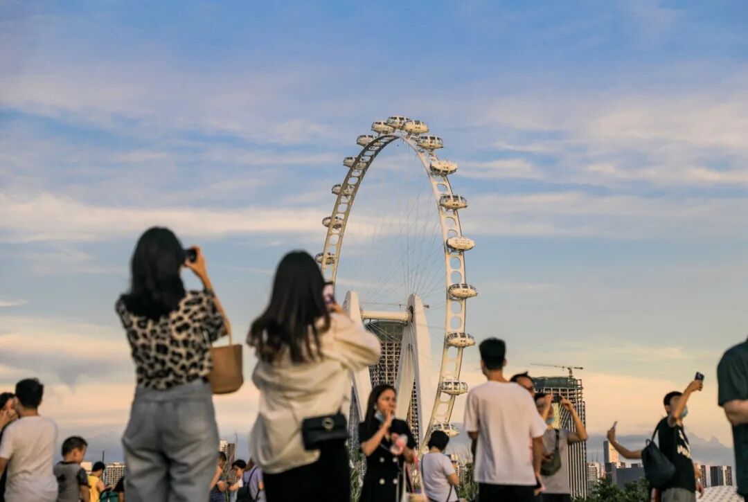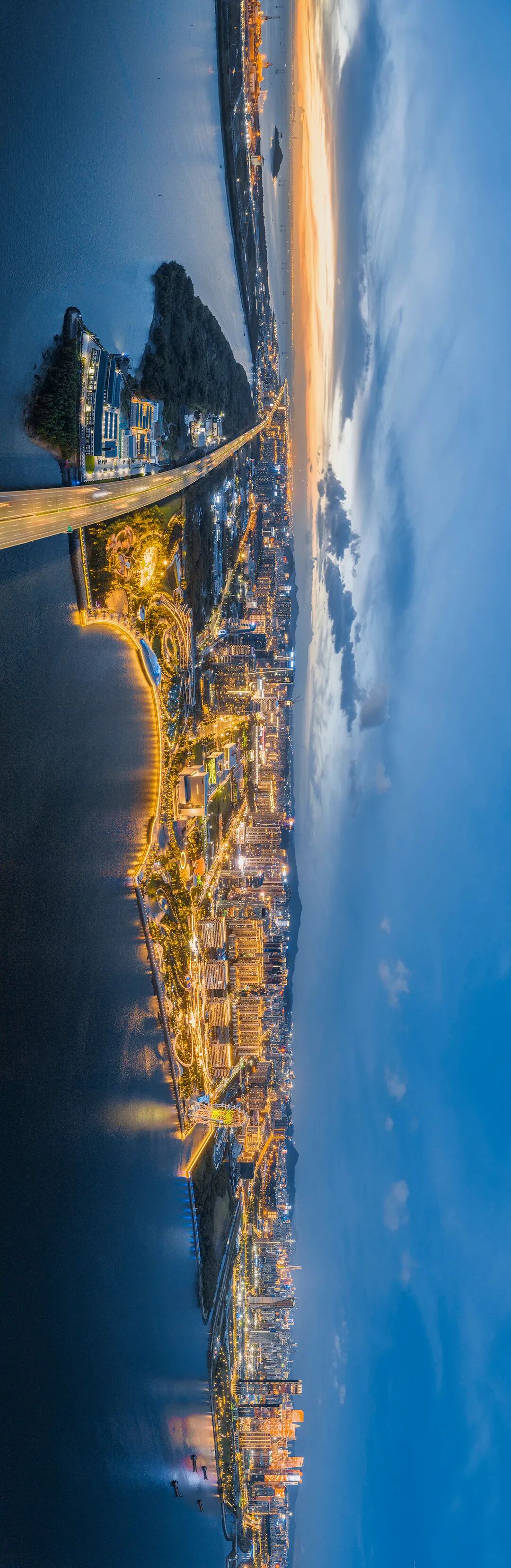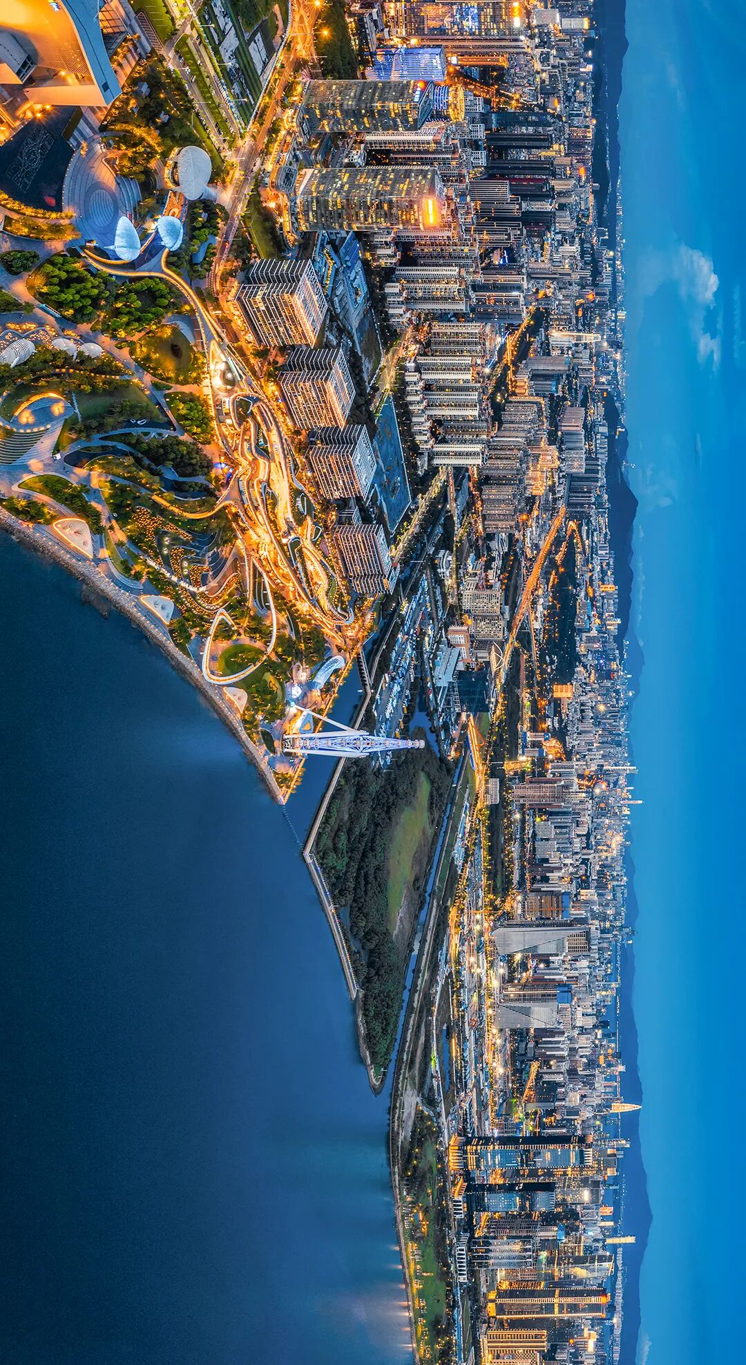 在湾畔观赏摩天楼宇簇群和城市天际线