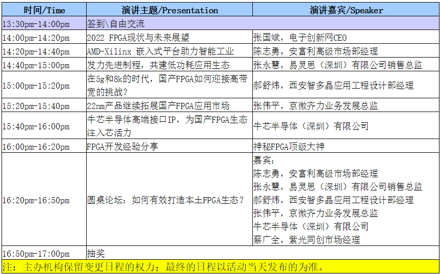 为了保证参展和参观效果,主办单位就开幕时间做了微调,由原来的11月5-7日(周六、周日、周一)调整为11月6-8日(周日、周一、周二)。因此我们的FPGA生态峰会也相应往后顺延至11月6号,地点不变。
