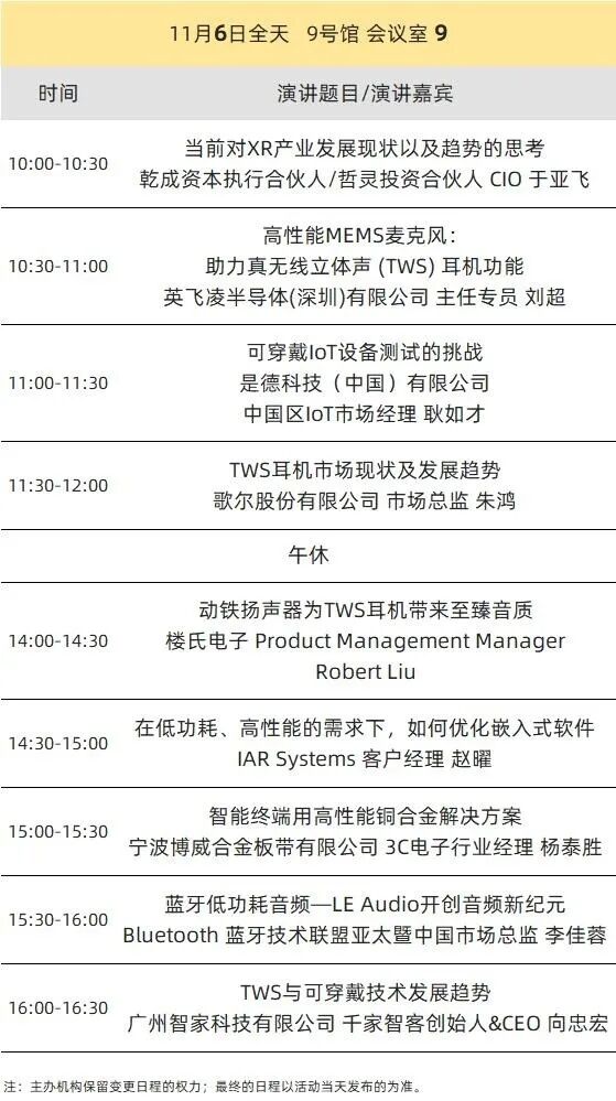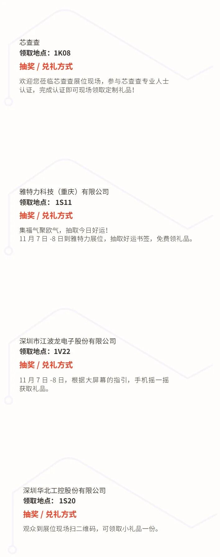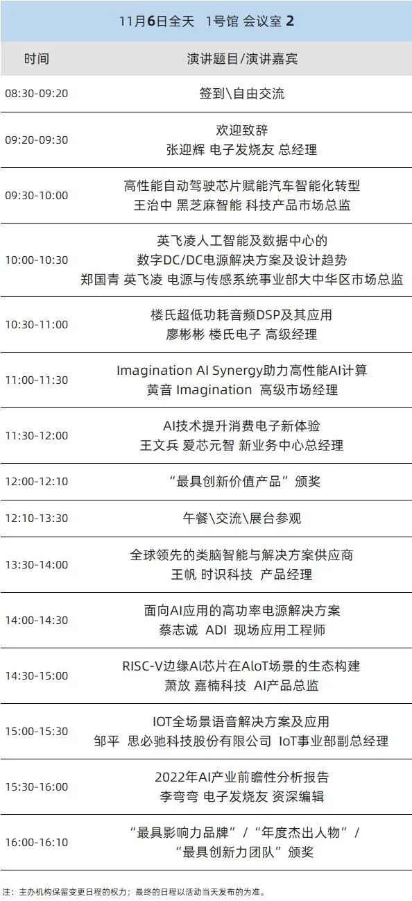 我爱方案网AIoT技术方案专区(1号馆1Y31):11月6-8日每天三场专场技术讲座:10:00-11:00显控/HMI;13:30-14:30工业物联网与边缘计算;15:30-16:30多媒体新零售和智慧校园领域。