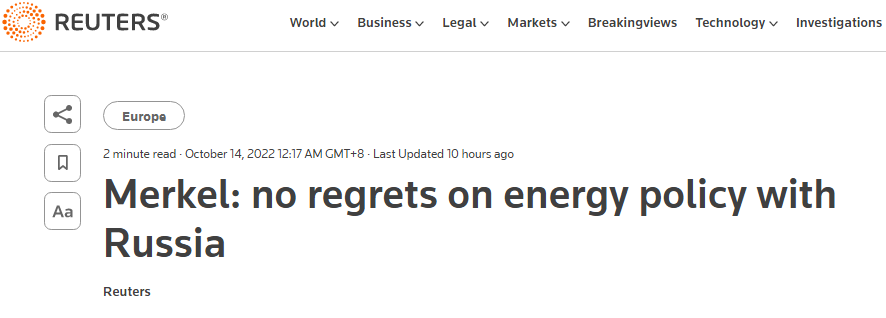 默大妈终究还是不忍心看德国民众处在水深火热之中!2005年至2021年12月,默克尔一直担任德国总理,在其执政期间,连接德国与俄罗斯的“北溪-1”天然气管道项目投入运营,将后者的天然气直接通过波罗的海下方的管道输送至德国。然而,自俄乌冲突发生以来,德国乃至整个欧盟,在美国的带领下,对俄罗斯能源施加制裁,导致欧洲遭遇能源危机,而严重依赖俄罗斯能源供应的德国更是受到强烈冲击。以至于在德国有不少人评判默克尔当初的行为,称其在任时期的政策让德国这个欧洲最大经济体过于依赖俄罗斯天然气。10月13日,据路透社、美联社等媒体报道,德国前总理默克尔在葡萄牙首都里斯出席一场活动,谈到她在任时德国政府的对俄能源等政策时,有记者对默克尔说,“你总是在所处时间采取相应行动”。默克尔针对记者的发言回应道,“(所以)在这方面,我一点也不后悔自己的决定,反过来说,我认为从当时的角度看这是正确的。”