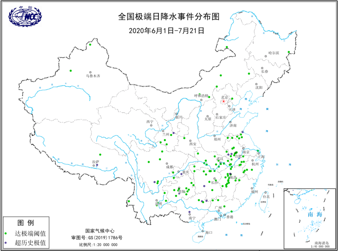 ▲6月1日-7月21日全国极端日降水事件分布