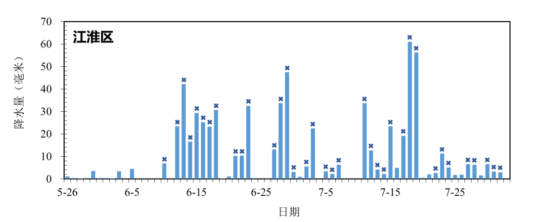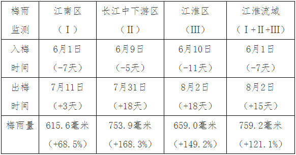 江淮区于6月10日入梅,较常年(6月21日)偏早11天,8月2日出梅,较常年(7月15日)偏晚18天;梅雨期长度为53天,较常年(25天)偏长28天;梅雨区平均雨量为659.0毫米,较常年(264.4毫米)偏多149.2%,为1961年以来次多(1991年最多,766.4毫米)。