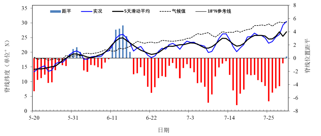 图5 5月下旬以来西太平洋副热带高压脊线位置逐日变化