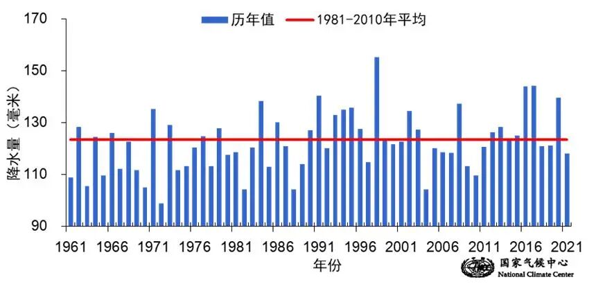 6月1日至7月6日全国平均降水量历年变化(毫米)(1961-2021年)