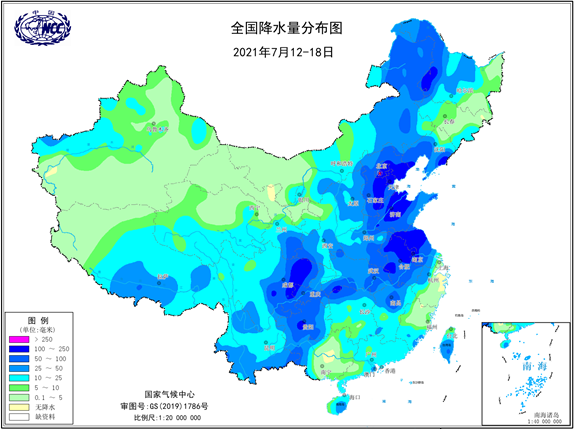 图1 2021年7月12-18日全国降水量分布图