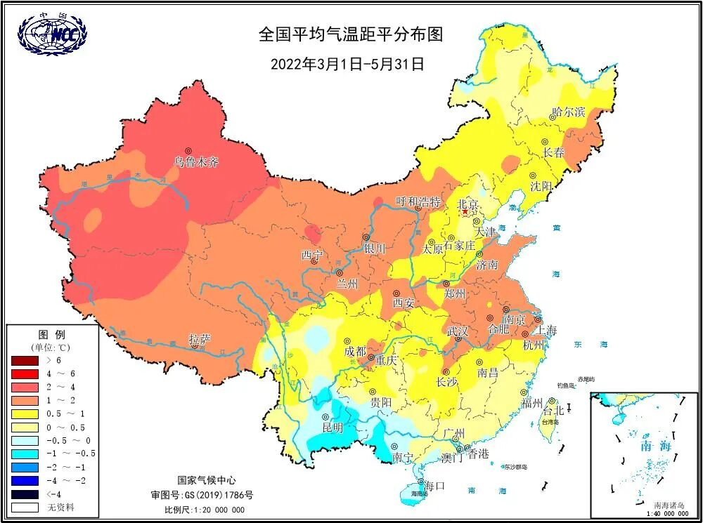 今年春季,全国大部地区气温较常年同期偏高0.5℃以上,其中东北东部、华东中北部、华中东部、西北大部及新疆和西藏大部、内蒙古中西部等地气温偏高1~2℃,新疆和西藏部分地区偏高2℃以上(图2)。江苏、安徽、青海、新疆、西藏平均气温为1961年以来历史同期最高,山东、宁夏为次高,上海、甘肃、陕西为第三高。