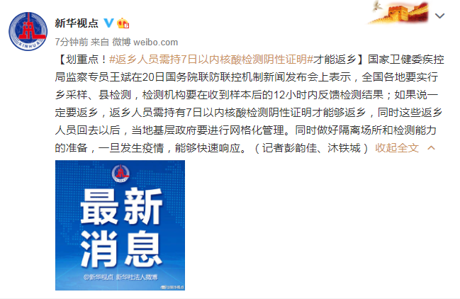 会上,国家卫健委疾控局监察专员王斌表示,全国各地要实行乡采样、县检测,检测机构要在收到样本后的12小时内反馈检测结果;如果说一定要返乡,返乡人员需持有7日以内核酸检测阴性证明才能够返乡,同时这些返乡人员回去以后,当地基层政府要进行网格化管理。同时做好隔离场所和检测能力的准备,一旦发生疫情,能够快速响应。