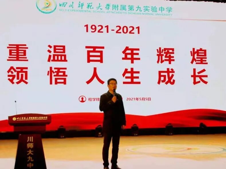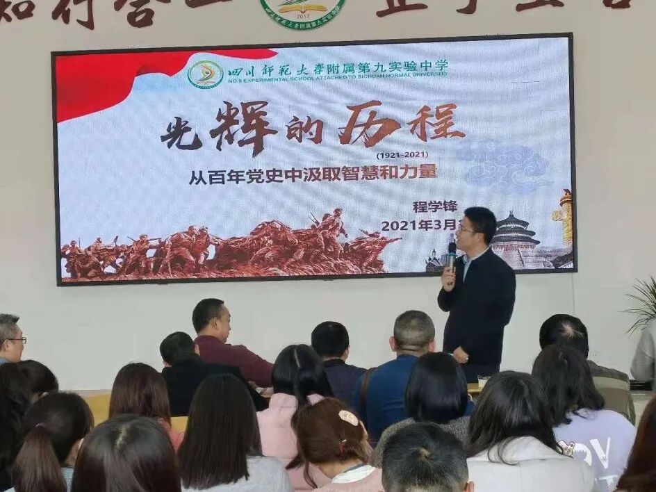 3月5日,青年讲师团成员、川师大九中程学锋老师以“光辉的历程——从百年党史中汲取智慧和力量”为主题,在学校知明楼学二楼会议室为学校全体教师开展党史专题讲座,现场人员120余人。5月6日,在川师大九中纪念五四运动102周年主题团日活动中,学校程学锋老师以“重温百年辉煌 领悟人生成长”为主题,在学校演艺大厅为学校800余名中学生开展党史专题讲座。