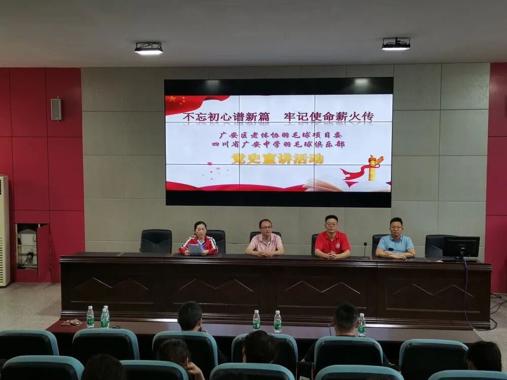 5月17日下午,青年讲师团成员、广安中学团委曾译,在广安中学第二学术报告厅,围绕“不忘初心谱新篇,牢记使命薪火传”为主题,为广安区老体协羽毛球项目委和广安中学羽毛球俱乐部48名成员,开展党史学习专题宣讲。