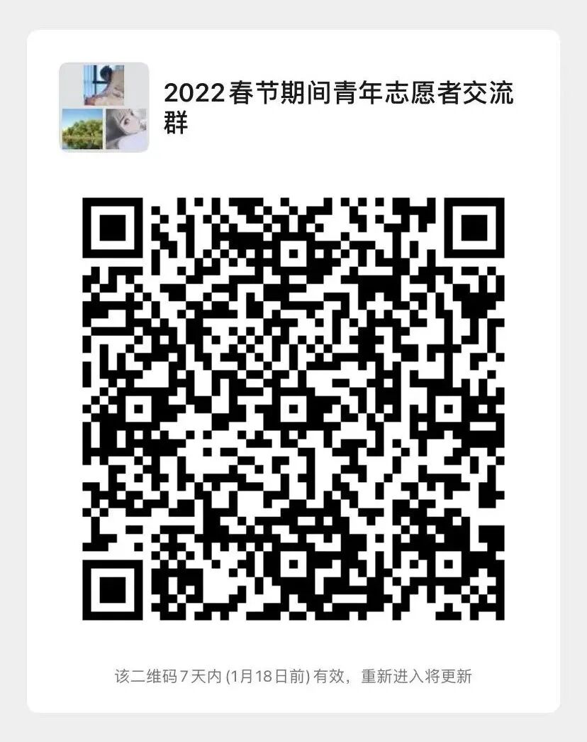 打开微信扫描下方二维码加入“2022春节期间青年志愿者交流群”(进群时备注名“姓名+手机号+专业”),咨询电话:张老师 (0826)2332056。