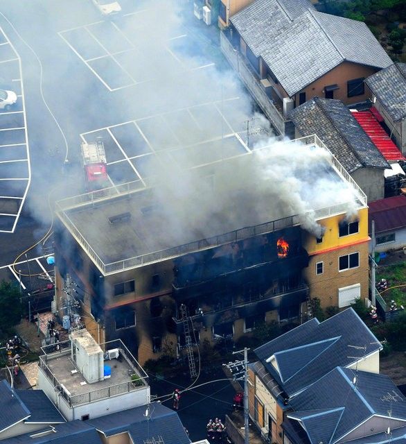 2019年7月18日,在京都府京都市伏见区桃山町京都动画第一工作室,一名男性倾倒类似汽油的液体,随即引发爆炸与大火,造成京都动画第一工作室楼高三层的建筑物完全烧毁,导致36人遇难。
