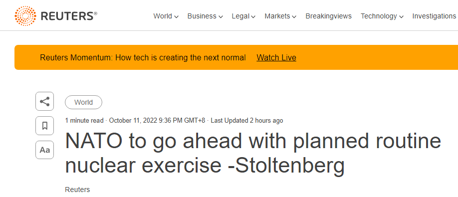 路透社:斯托尔滕贝格称,北约将按计划举行例行核演习