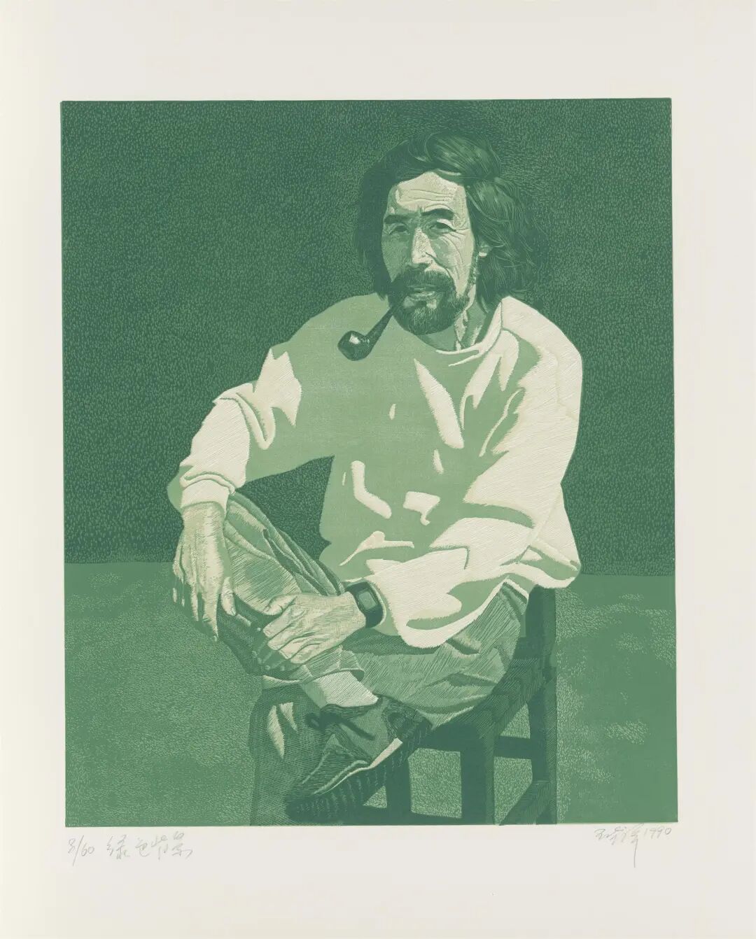 王华祥,近距离-绿色背景,彩色木刻,68.8x57.7厘米,1990年