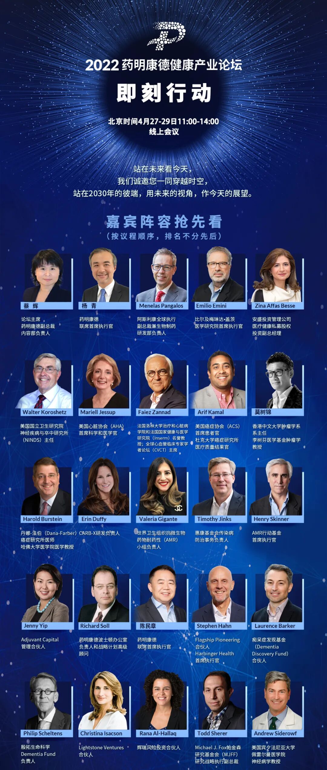 本次药明康德健康产业论坛为期三天,在神经系统疾病之外,也将关注多个重大疾病领域的未竟健康需求,探寻全球创新解决方案。来自世界卫生组织、比尔及梅琳达·盖茨医学研究院、美国心脏协会(AHA)、美国癌症协会(ACS)的行业领袖,阿斯利康、强生等全球大型医药企业“研发掌门”,全球多家顶尖高校的医学专家,将共同呈现精彩探讨。