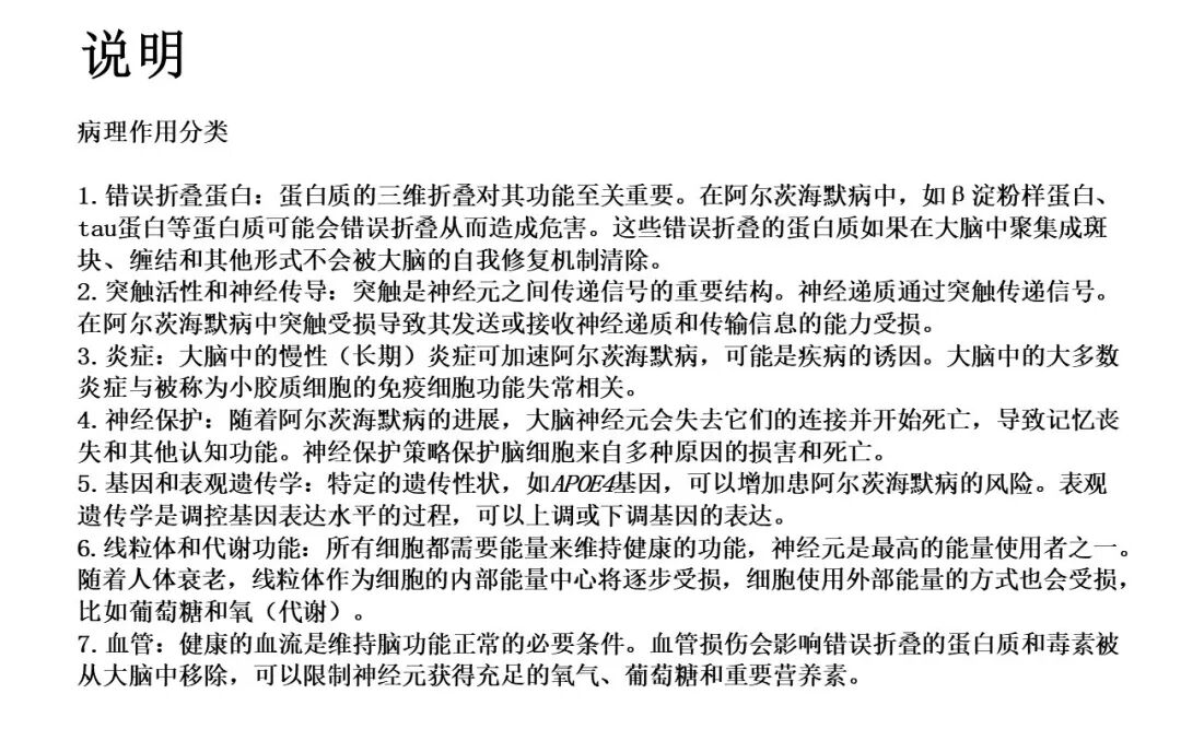 - 药物开发趋势一:靶点去中心化——阿尔茨海默的疾病靶点将以错误折叠蛋白为主转向突触活性和神经传导、炎症等更多机制多点发力。