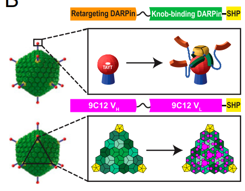 通过在病毒样颗粒表面装饰可以高亲和力靶向不同抗原的衔接蛋白(adapter proteins),这一系统可以将转基因精准递送到表达特定抗原的组织或细胞中。