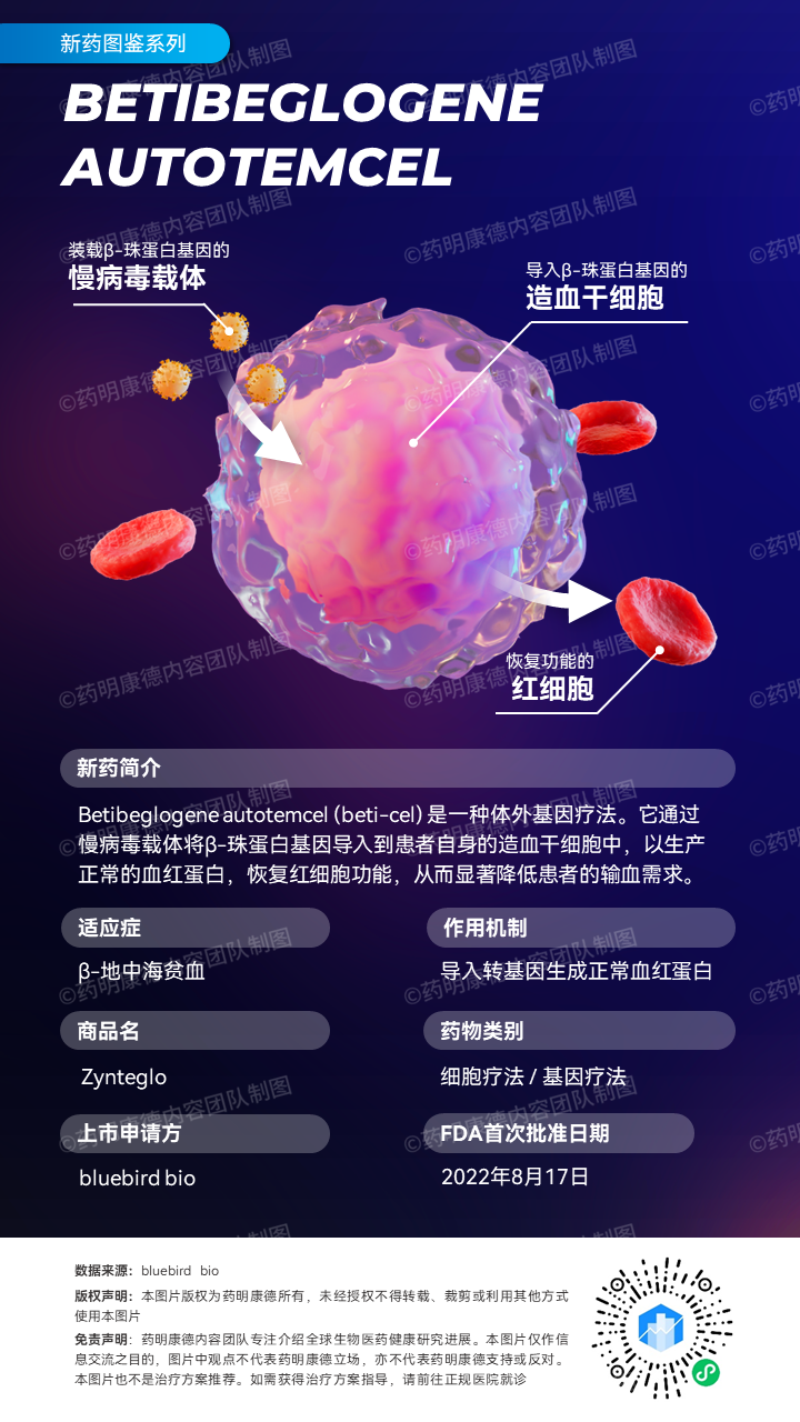 Zynteglo的效果和安全性得到两项多中心临床研究的支持。参与者包括需要接受常规血红细胞输注的成人和儿童β地中海贫血患者。疗效的评估标准为输血独立性(transfusion independence),定义为患者在不接受血红细胞输注的情况下,维持预定的血红蛋白水平至少12个月。在接受Zynteglo治疗的41名患者中,89%达到输血独立性。最新随访结果显示,这一疗效表现出良好的持久性。bluebird bio公司首席执行官Andrew Obenshain先生表示:“经过十多年的研究和临床开发,依托临床医生、患者和他们家人的韧性,Zynteglo的获批是基因疗法领域的分水岭。作为美国FDA批准治疗β地中海贫血的首款慢病毒载体离体基因疗法,我们正在揭开一个新时代的帷幕。针对承受终身治疗负担的患者,基因疗法具有革新已有治疗模式的潜力。”今年是基因疗法治疗血液疾病大爆发的一年,除了Zynteglo获得美国FDA批准,BioMarin Pharmaceutical公司开发的基因疗法Roctavian(valoctocogene roxaparvovec)也已经获得欧洲药品管理局人用药品委员会的支持,有望在今年成为首款获批治疗血友病A的基因疗法。CSL Behring与uniQure合作开发的基因疗法etranacogene dezaparvovec也已经获得美国FDA授予的优先审评资格,有望在今年成为首个治疗血友病B的基因疗法。期待创新疗法的出现让患者摆脱终身接受治疗的负担,迎接更为健康、积极的生活!了解更多FDA获批新药