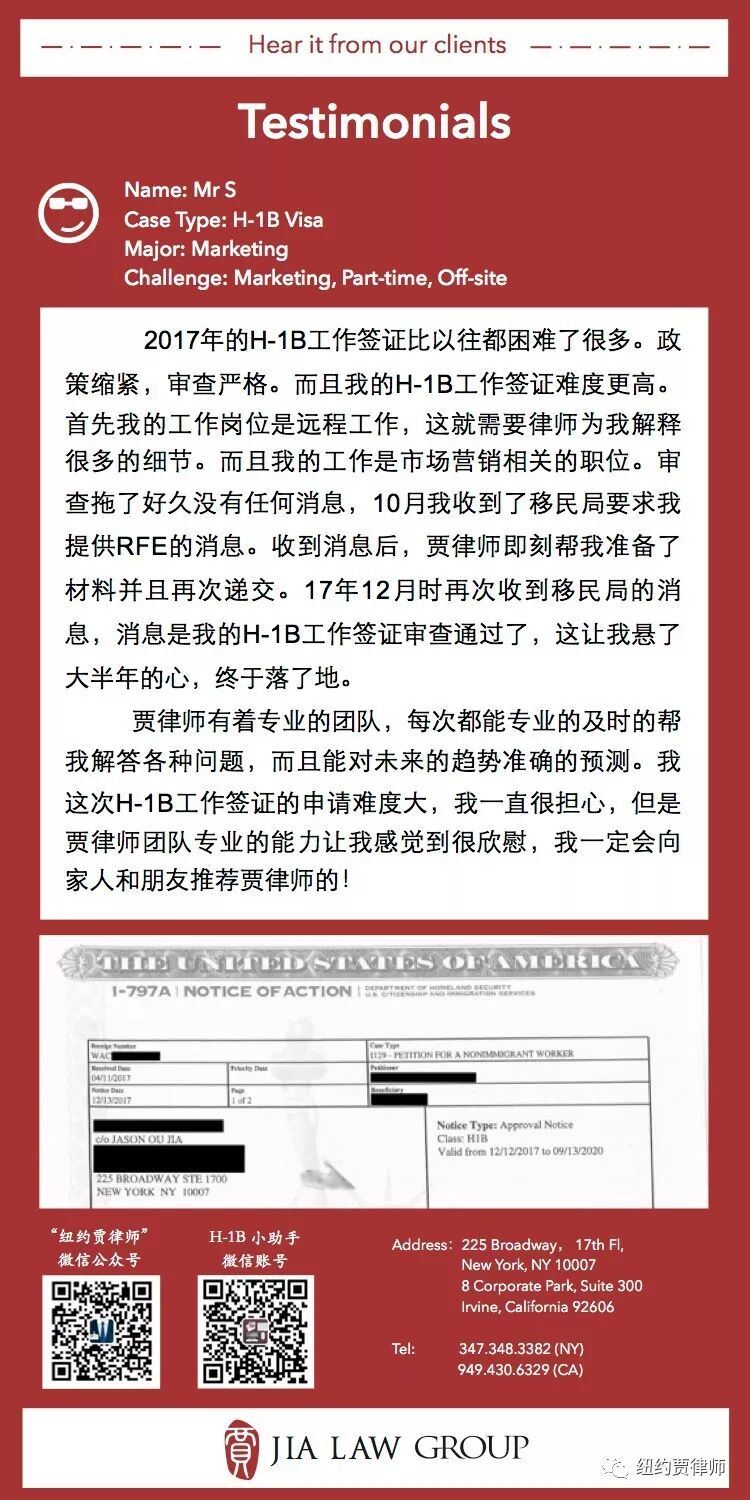 政策严格,若想顺利通过审查,就更加需要充分的准备。我们在2017年同样有一个经典案例:我们的客户S先生有一份Marketing相关的工作。众所众知Marketing类的职位一直都是比较难通过的,而且S先生的工作不但是兼职,还是远程上班,这都给申请带来了极大的难度。但是我们在了解S先生的情况后,积极和雇主沟通,充分的准备了材料,面对移民局的RFE,我们准备的材料有理有据,最终成功说服移民局让S先生拿到H1B签证。拿到H1B的他激动的给我们写了一封感谢信:
