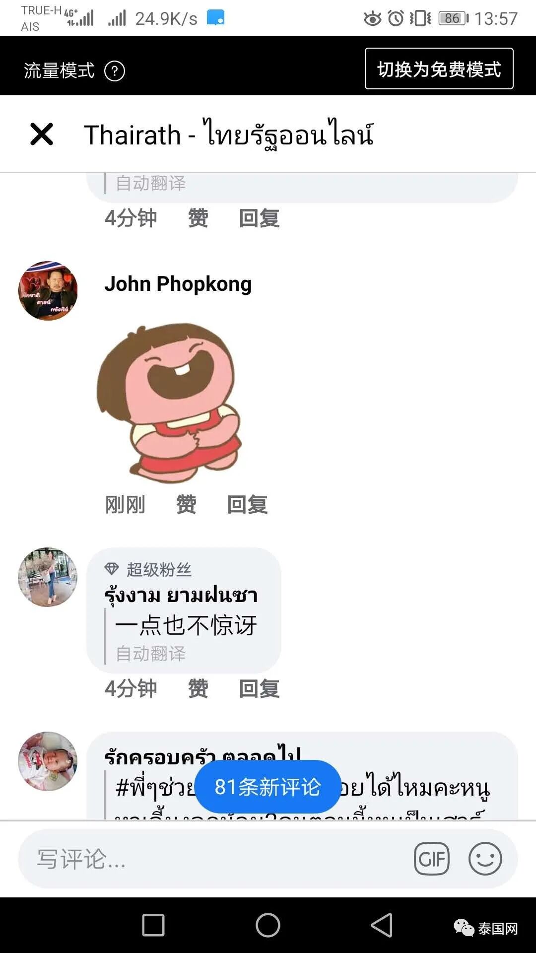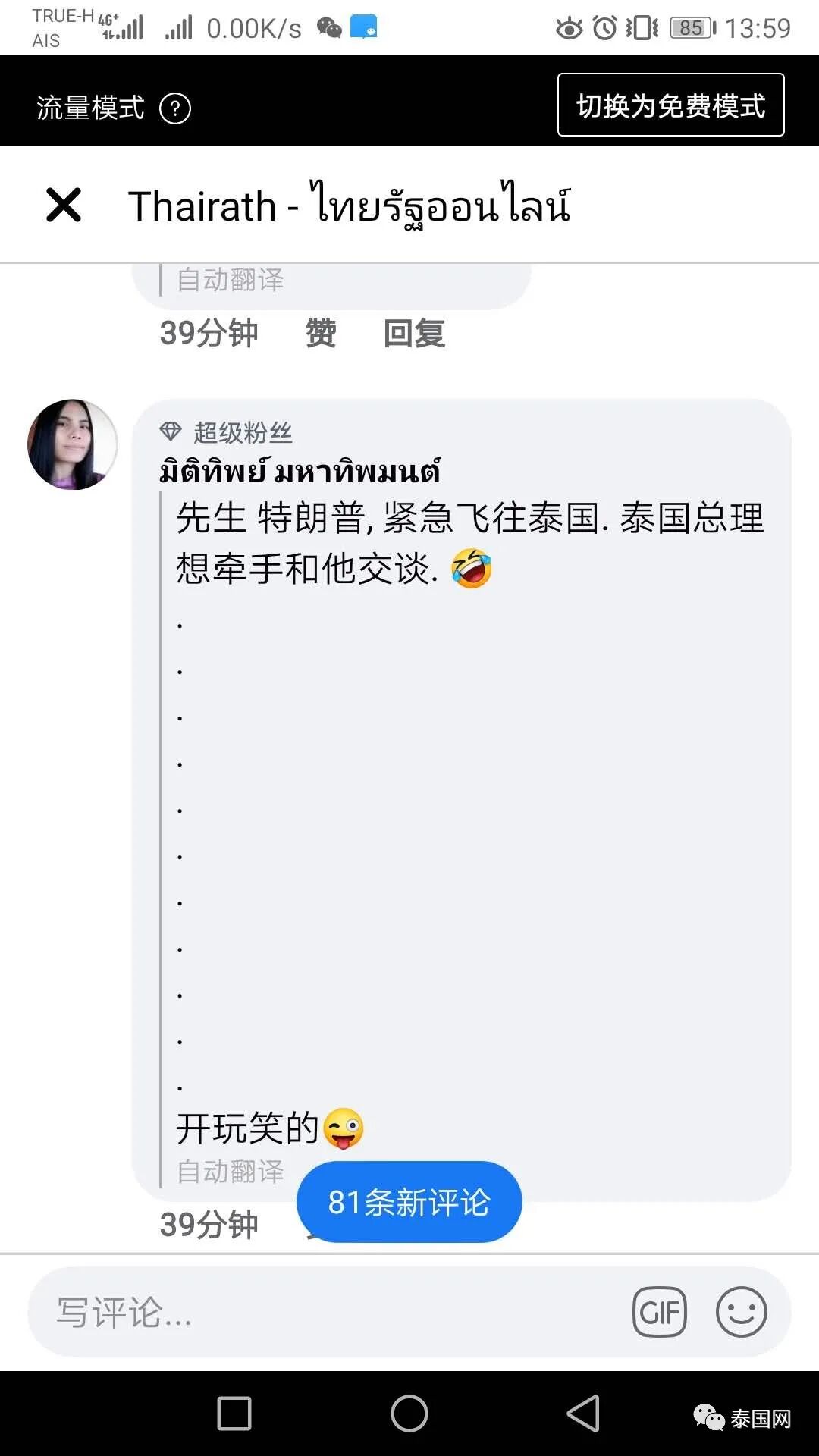 10月2日中午,特朗普确诊消息基本传遍泰国全网,我在泰国最大报刊《泰叻报》的官方facebook账号上,点进特朗普确诊的新闻页面,然后从上往下,截取了前五十条的泰语读者留言。
