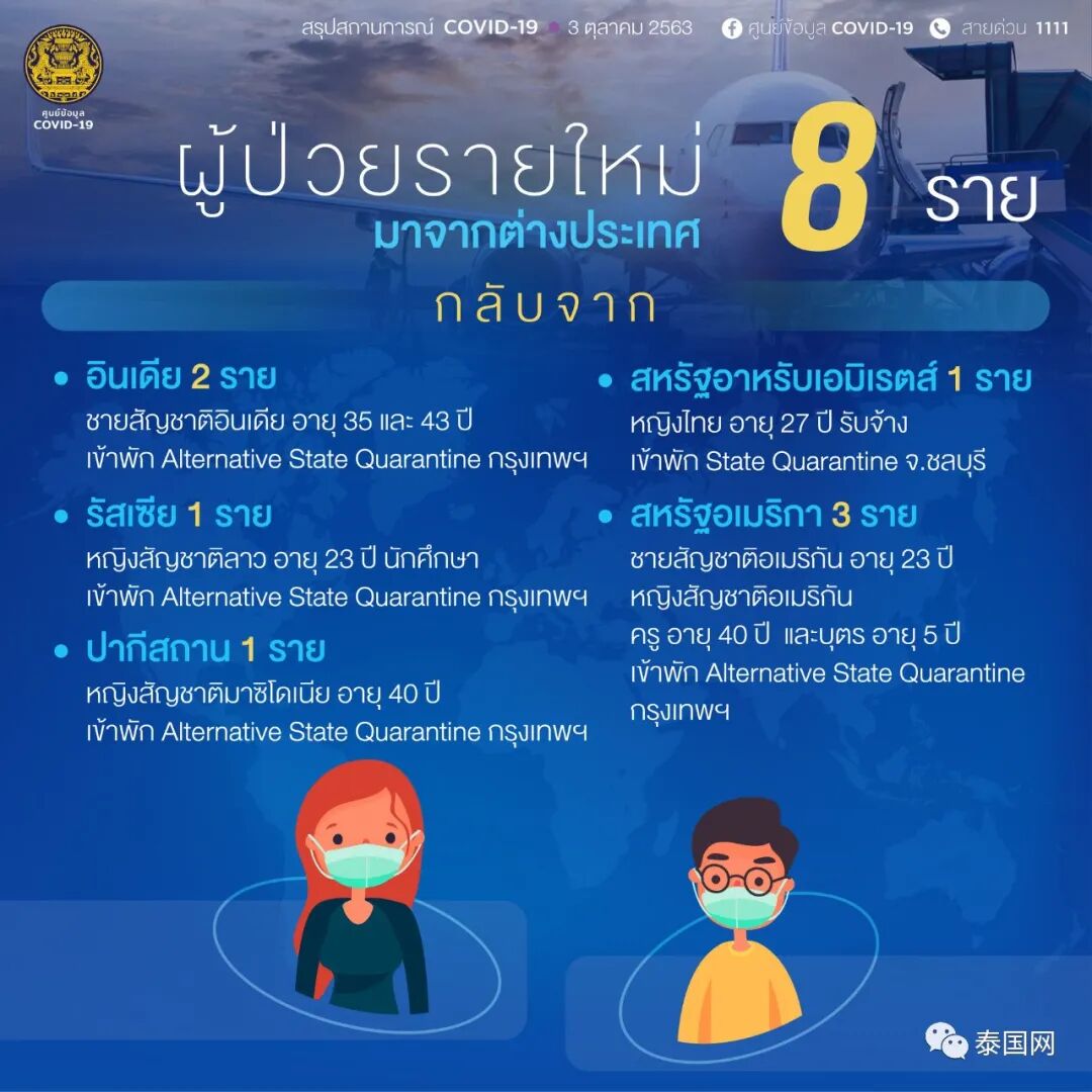 泰国网报道,10月3日,据泰国疫情信息中心最新消息,泰国今日新增8例境外输入病例。