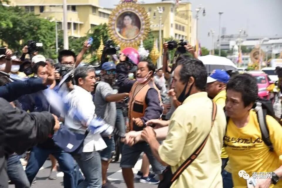 10月14日下午13:00左右,泰国“人民团”抗议者和身穿黄色衣服等候国王圣驾的民众在曼谷民主纪念碑发生了摩擦,双方互相投掷物品,以至于警方需介入制止。