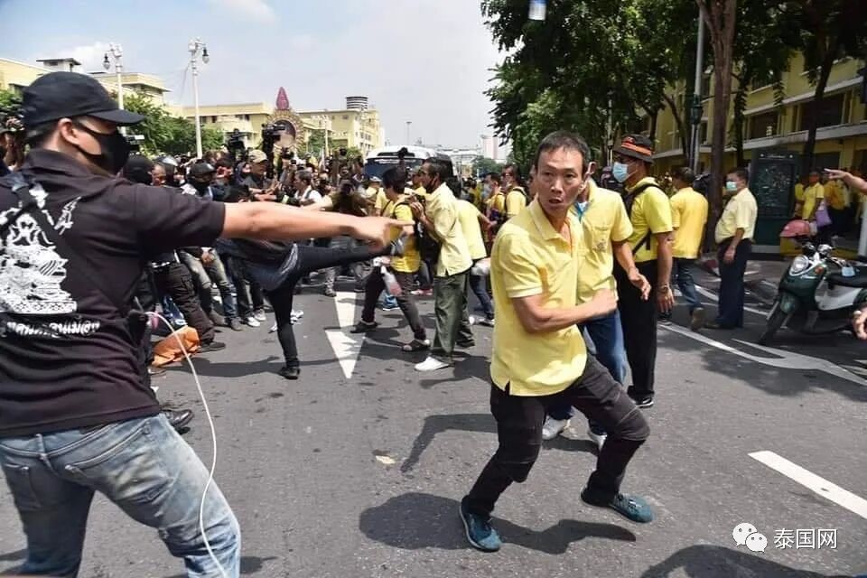 第二天,在王家车队“赐见”民众的街道两旁,黄衣的“保王派”和黑衣的示威者隔街对峙,大打出手。
