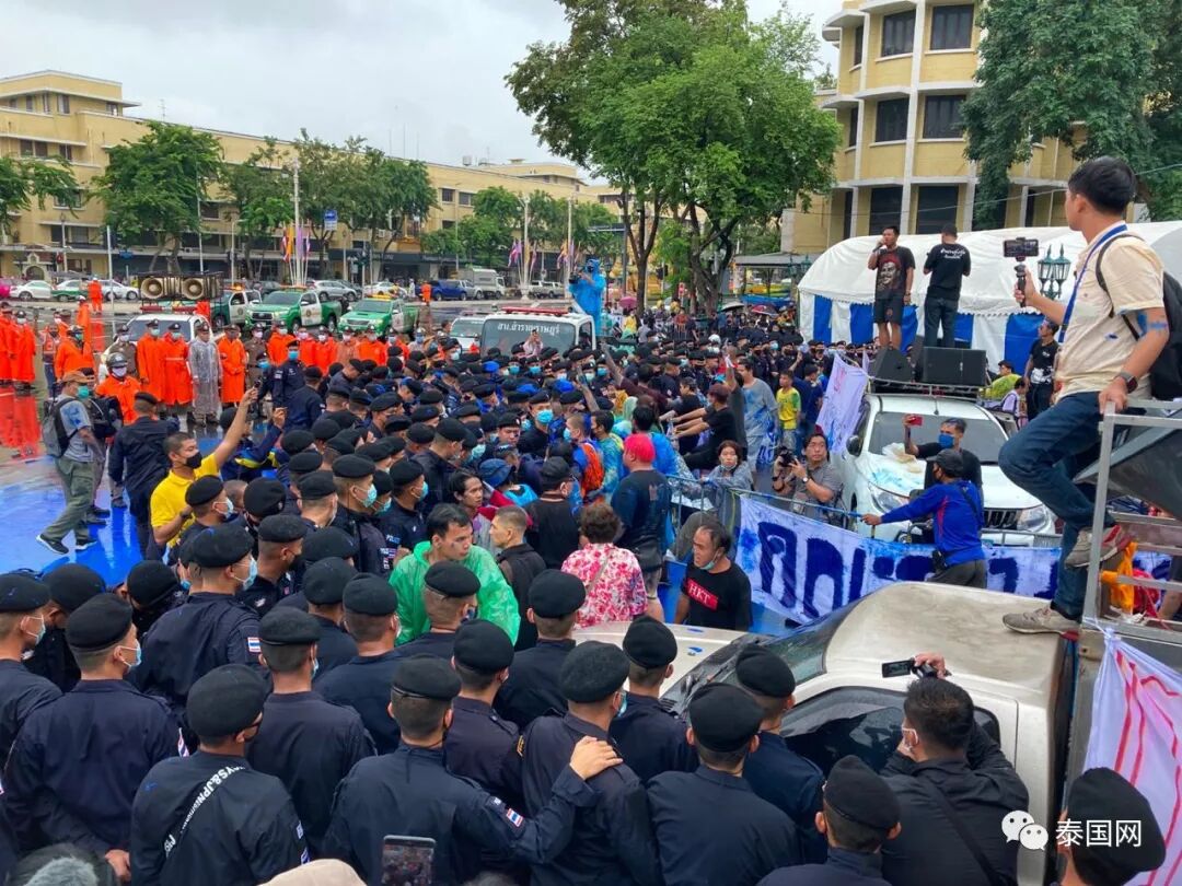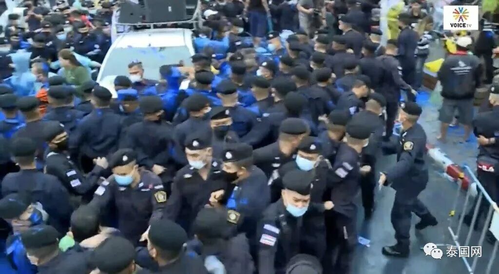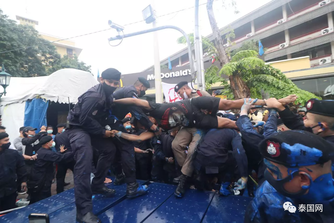 10月13日下午,泰国警方在曼谷民主纪念碑附近逮捕了数名集会领导者,这引起了部分民众不满。