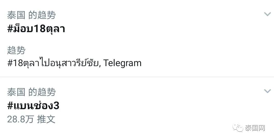 10月18日,“抵制三台”话题登上泰国推特热搜热榜前三,众多泰国反政府联盟“变法派”抗议集会人士在话题中频刷抵制三台的所有节目、电视剧、广告、演员等相关内容,并频繁附上抗议集会期间警方与集会人士的对峙图,强烈抨击三台。