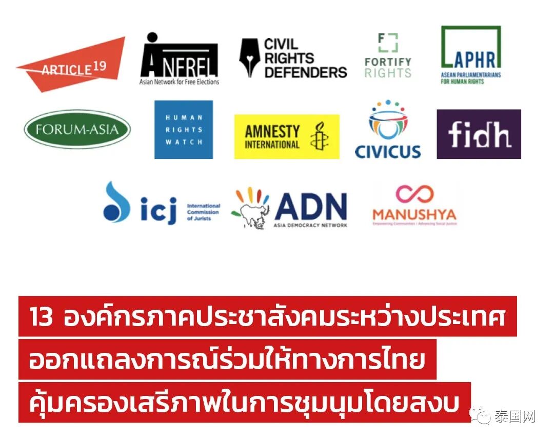 据泰媒消息,近日,包括东盟人权议员组织等在内的13家国际组织针对泰国17日和25日的抗议集会发表联合声明,他们呼吁泰国政府捍卫和平集会的权利。