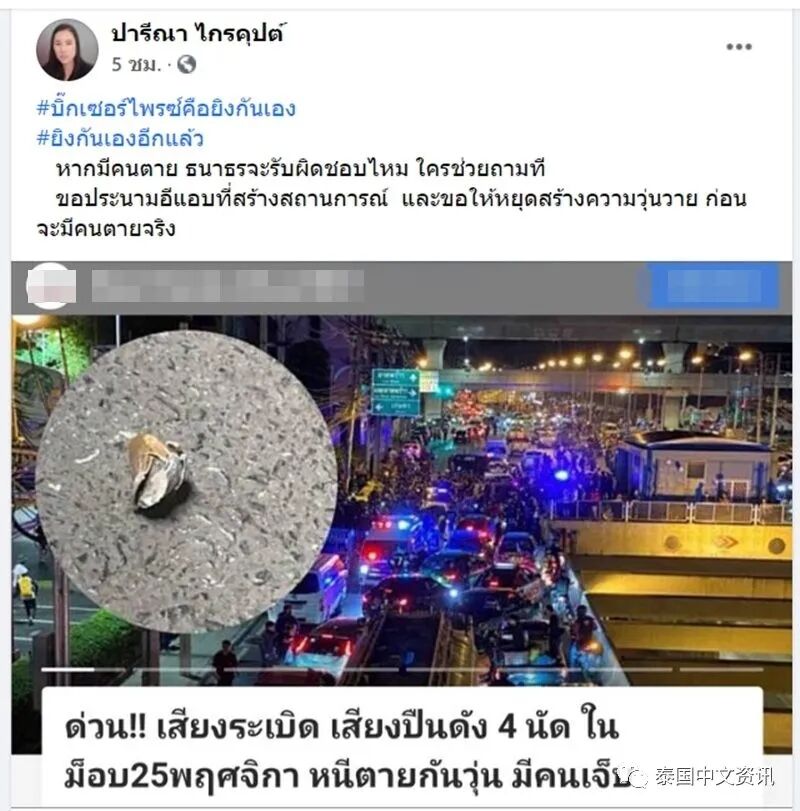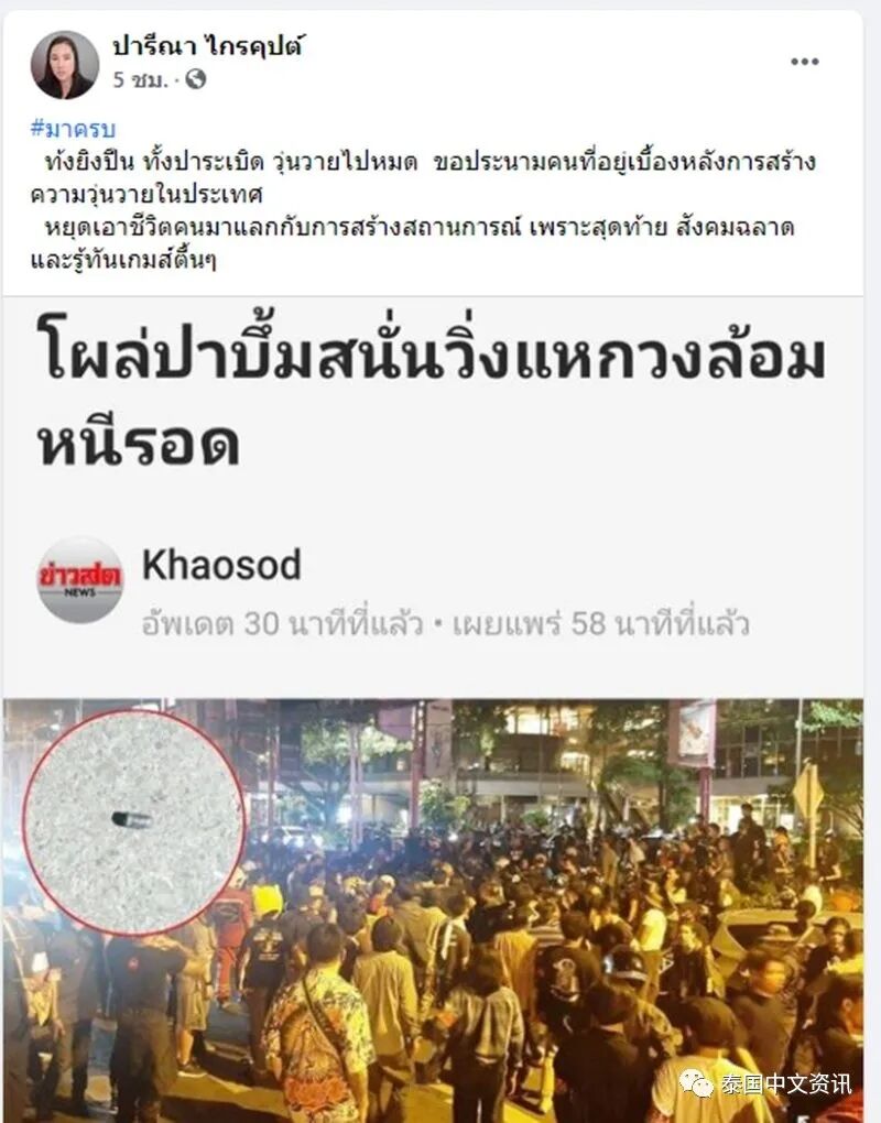 11月26日,泰国执政联盟核心政党公民力量党下议院议员巴妮娜在社交账号发帖提及上述枪击案时称,如果有人死亡,“前进团”主席塔纳通负责吗?