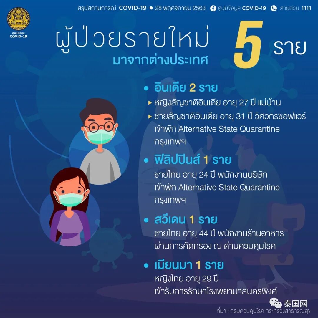 据泰国疫管中心最新消息,11月28日,泰国新增5例确诊病例。今日确诊的病例均为境外输入病例,3人为泰国人,2人为外国人。