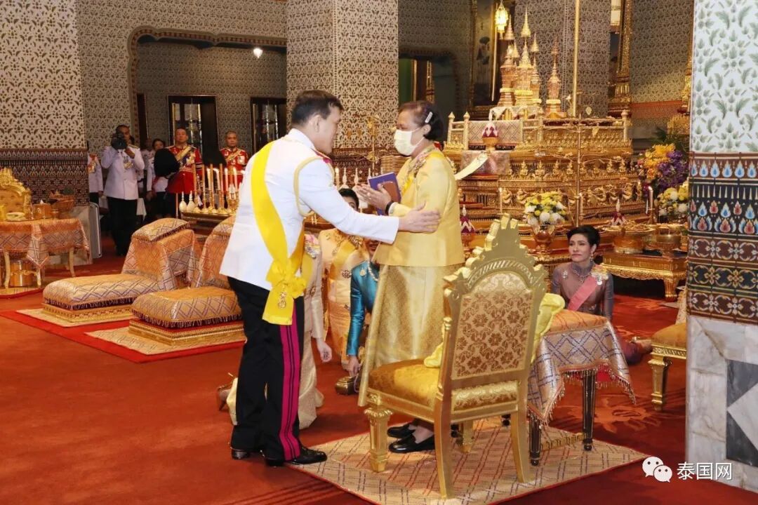 在刚出大皇宫门到达皇家田广场期间,泰国记者拍下暖心一幕,车停之时诗妮娜贵妃下车奔向在路旁接驾的民众,并从其中一位民众手中拿到民众的敬献物品,诗妮娜贵妃拿到物品后,又转身奔向御驾将该物交由素提达王后。(Cr. Wassana Nanuam)