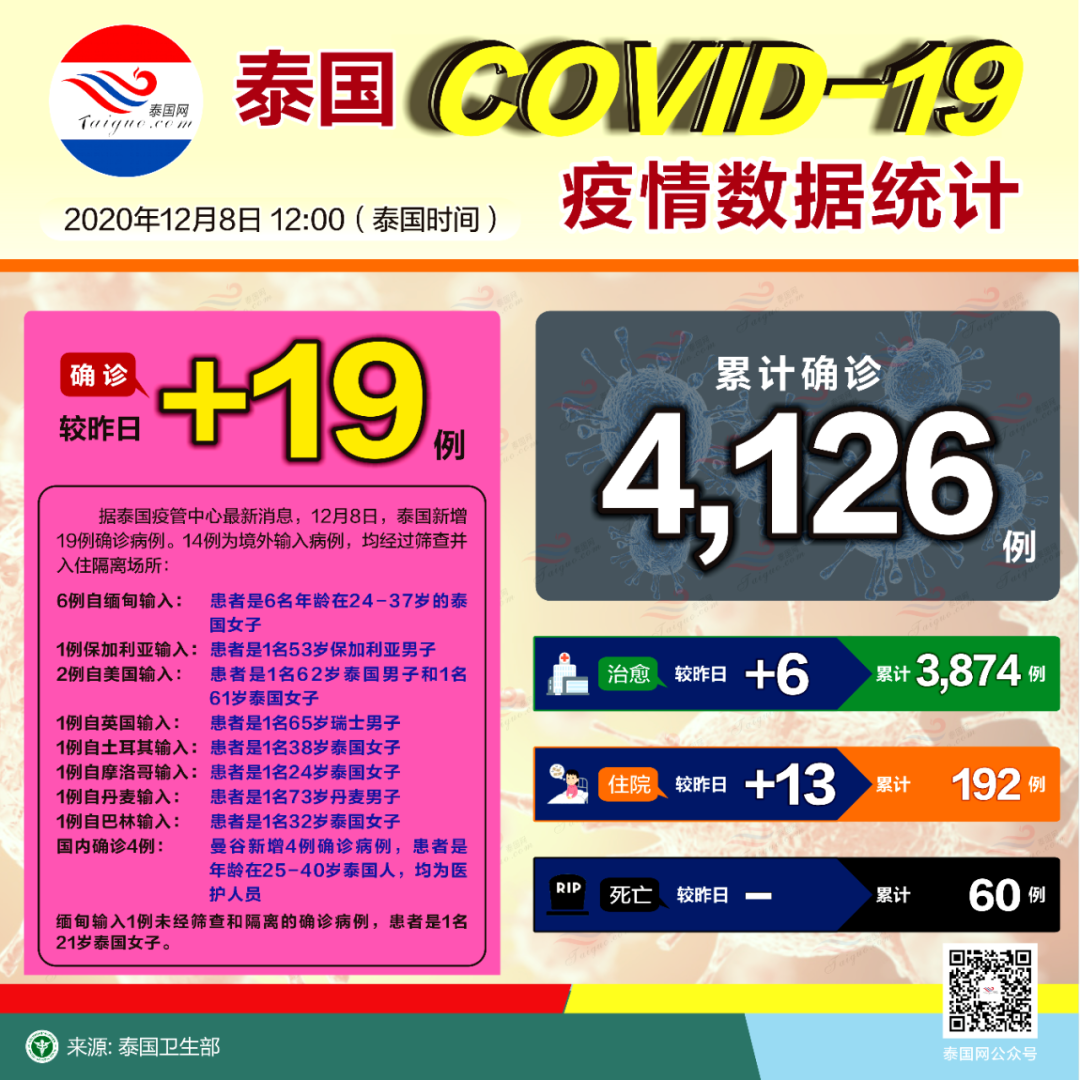 据泰国疫管中心最新消息,12月8日,泰国新增19例确诊病例。