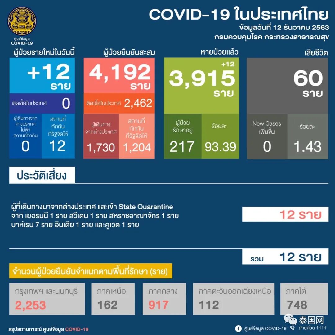 截止12日泰国累计确诊4192例;新增12例治愈病例,累计治愈3915例;累计死亡60例,尚有217人在院治疗。