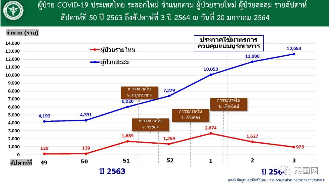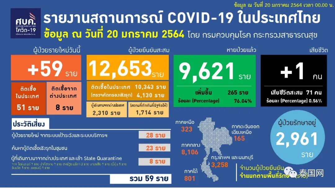泰国网报道,据泰国疫管中心消息,1月20日,泰国新增59例确诊病例,累计确诊12653例;新增治愈265例,累计治愈9621例,尚有2961例在院治疗;新增1例死亡病例,累计死亡71例。