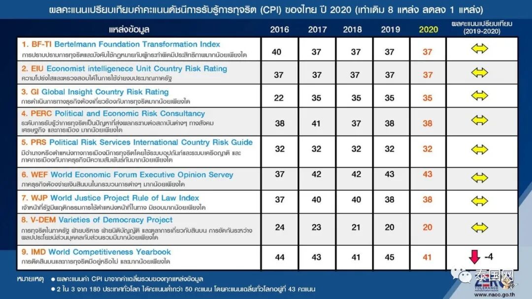 阿努查透露,根据国际透明组织(TI)公布的数据,在过去的4-5年,泰国的清廉指数排名会随着数据来源、国家或地区数量等因素的变化而变化。