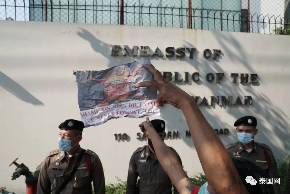 ▼ 缅甸驻曼谷大使馆前抗议民众