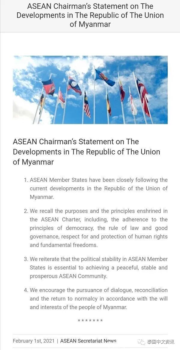 该消息传出后引来全球各国关注,邻国泰国多位政府官员对缅甸政变作出回应,当天还有不少机构发文谴责缅甸军方。