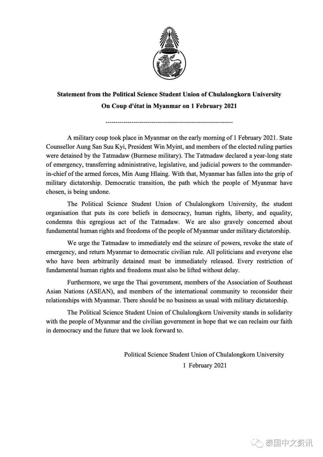 同日,泰国朱拉隆功大学政治学学生会组织就缅甸政变一事发表声明,谴责缅甸军方使缅甸陷入“军事独裁”的统治之下,称缅甸人民选择的民主道路正在被推翻。