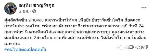 泰国网报道,2月21日,泰国副总理兼卫生部长阿努廷在其个人脸书发布了一张科兴疫苗的照片,并配文称这是科兴公司给他发的照片,确认首批送往泰国的疫苗即将出发,而这批疫苗也将如他在国会上所说,于2月24日抵达素万那普机场。