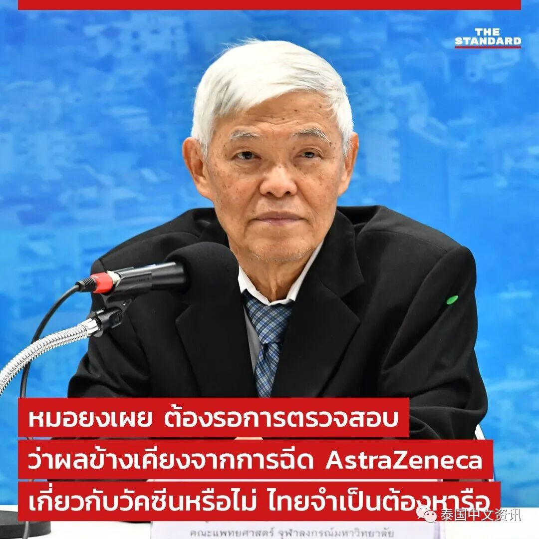 朱拉隆功大学医学院临床病毒学研究中心专家勇医生透露,泰国会推迟阿斯利康新冠疫苗的接种,但不是停止接种,预计接种时间将推迟1-2周。
