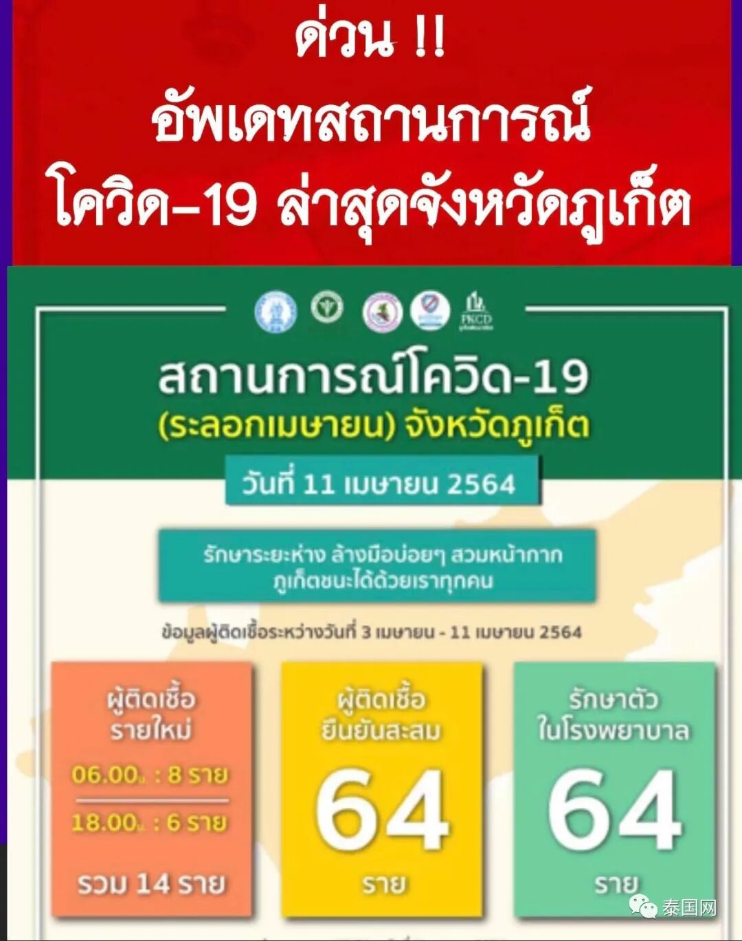 据普吉公共卫生办4月11日消息,截止当日 18:00普吉新增14例新冠肺炎确诊病例。