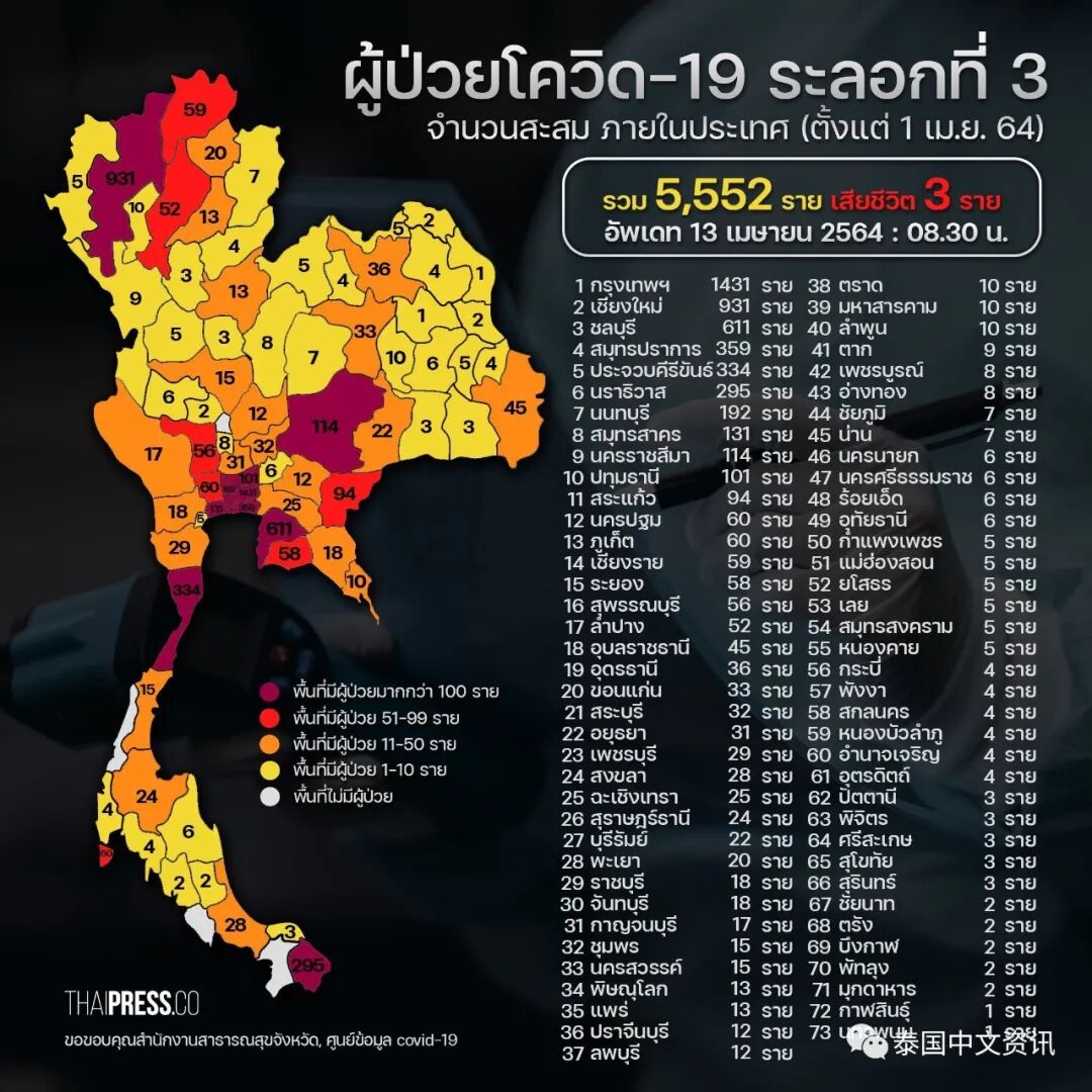 据泰媒4月13日消息,截至当地时间08:30,由曼谷通罗区娱乐场所引起的泰国第三轮已蔓延至全国73府,4月1-12日累计确诊5552例,死亡3例,其中曼谷、清迈、春武里、北榄、巴蜀确诊病例最多,疫情严峻。