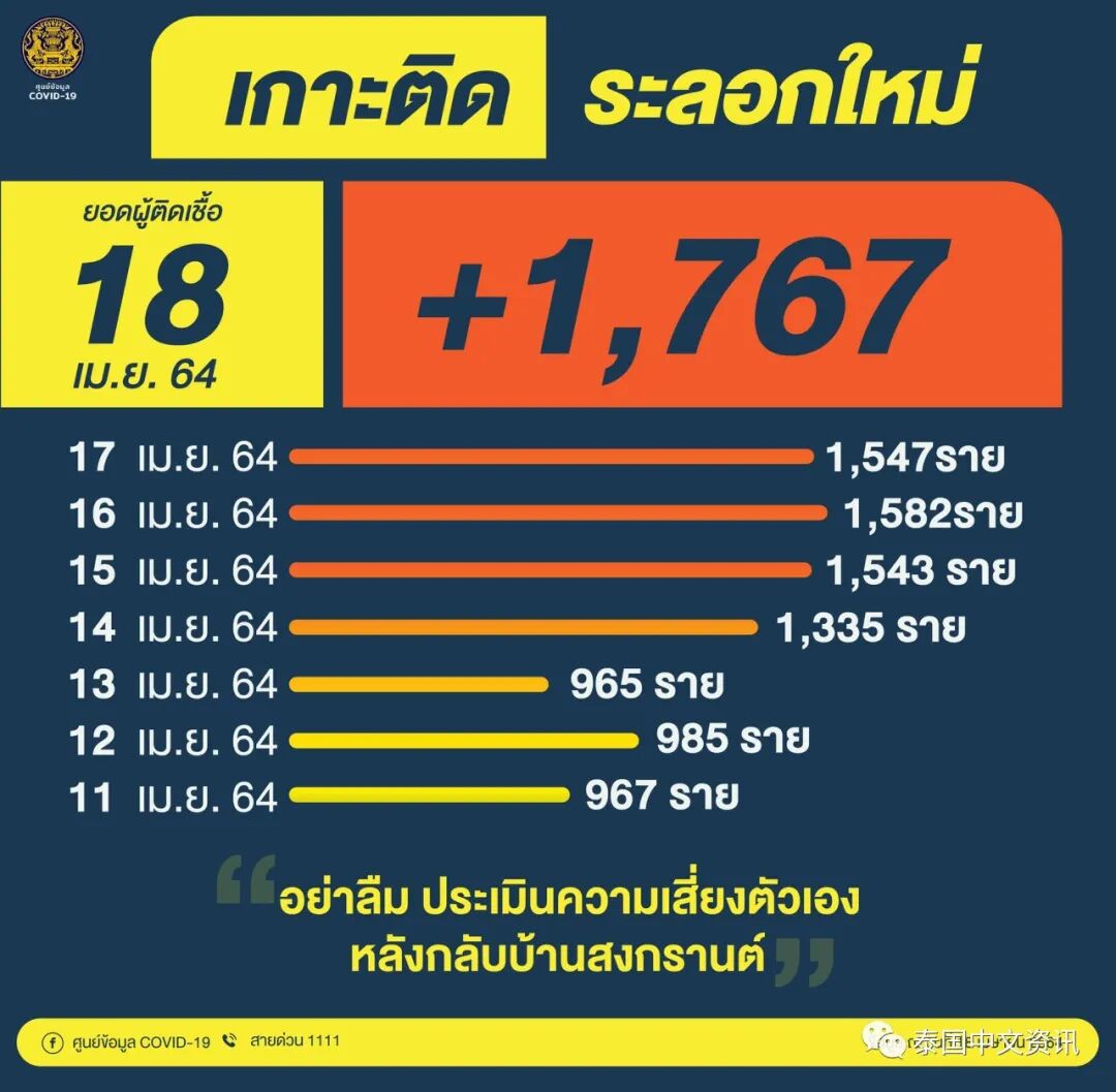 泰国网报道,据泰国疫管中心4月18日最新消息,今日泰国新增确诊1767例,其中包括本土确诊1765例、境外输入病例2例,累计确诊42352例。