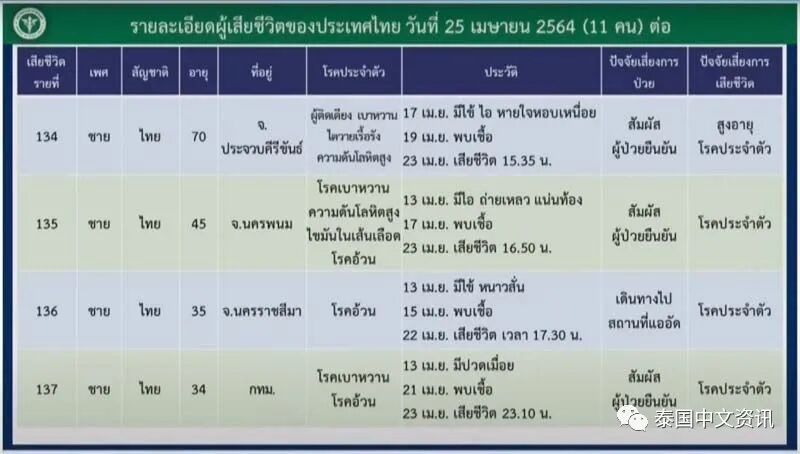 第137例。该患者为34岁泰籍男子,患糖尿病、肥胖症,曾接触确诊患者。4月13日患者出现身体酸痛症状,4月21日经查确诊,4月23日病逝;