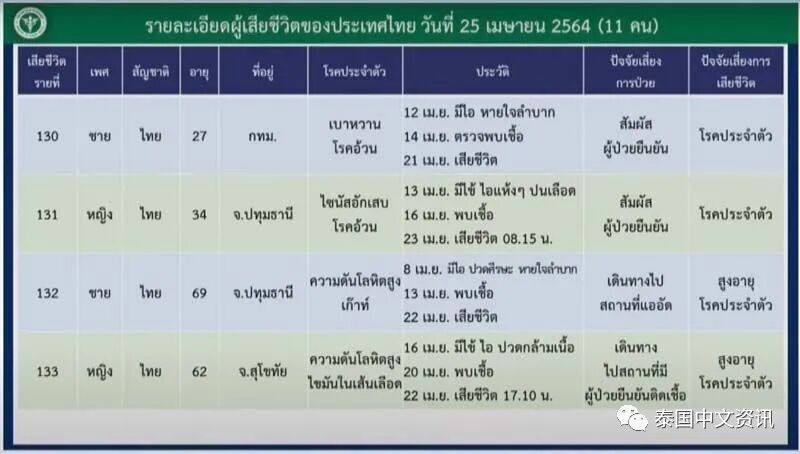 第130例,该患者为27岁泰籍男子,有糖尿病、肥胖症,曾接触过确诊患者。4月12日患者出现咳嗽、呼吸困难等症状,4月14日经查确诊,4月21日病逝;