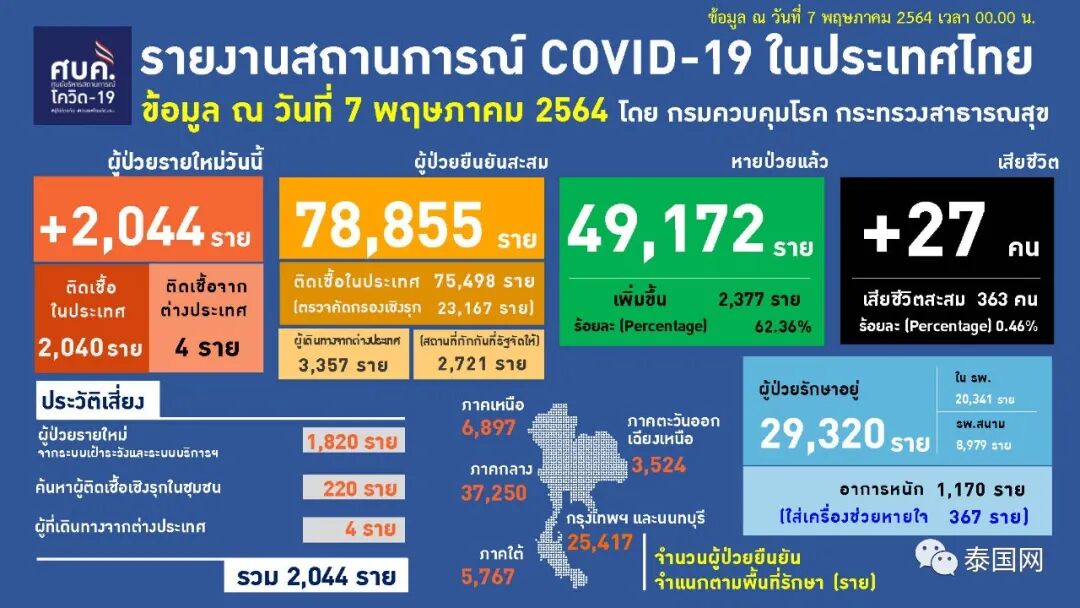 据泰国公共卫生部官方消息,截至5月7日当地时间07:30,泰国新增2044例确诊病例,新一轮疫情累计确诊49992例;新增2377例治愈病例,累计治愈21746例;新增27例死亡病例,自暴发疫情以来至今泰国累计有363例死亡病例。
